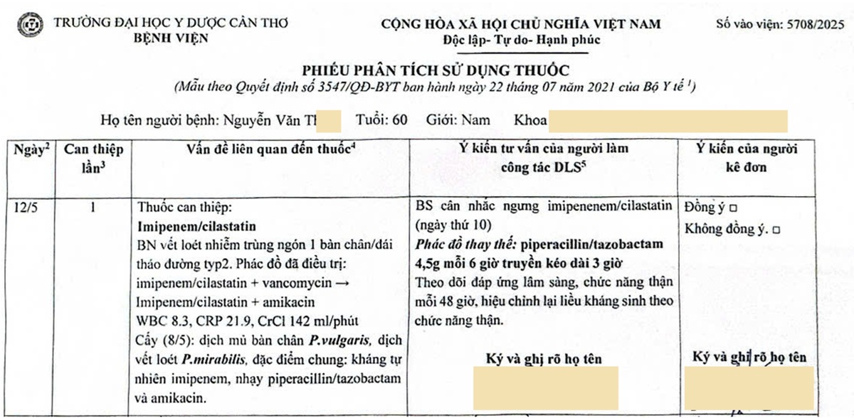Người bệnh không đáp ứng với imipenem/cilastatin + amikacin sau 72 giờ: sốt kéo dài, CRP cao, vết loét không cải thiện, chứng tỏ imipenem không hiệu quả lâm sàng, là một trường hợp của đề kháng nội tại.