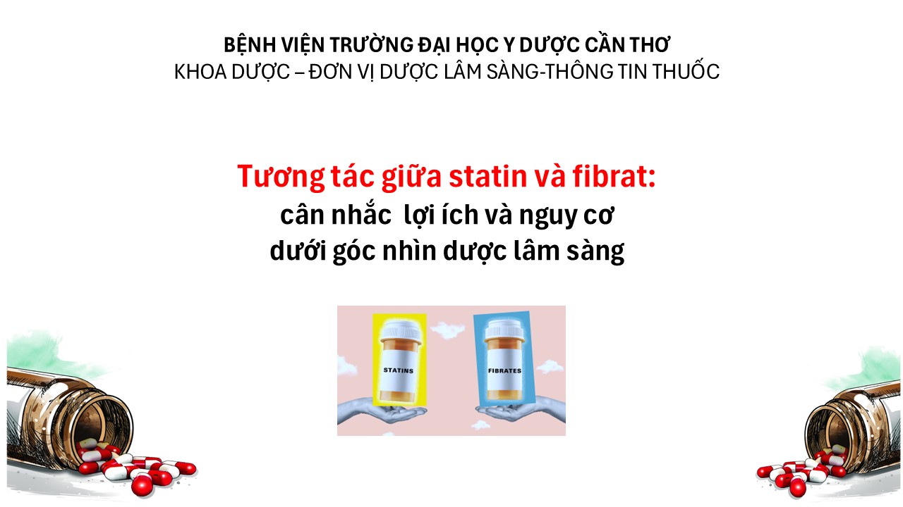 Tương tác giữa statin và fibrat được xem xét qua một ca lâm sàng thực tế, giúp làm rõ những lợi ích và nguy cơ khi phối hợp hai nhóm thuốc này trong điều trị rối loạn lipid máu hỗn hợp. Phần trình bày nhấn mạnh tầm quan trọng của việc cá thể hóa điều trị, đặc biệt ở người bệnh có triglycerid rất cao và nguy cơ tim mạch lớn. Các khuyến cáo theo dõi lâm sàng cụ thể cũng được đưa ra nhằm đảm bảo hiệu quả và an toàn, với vai trò đồng hành của dược sĩ lâm sàng trong suốt quá trình điều trị.