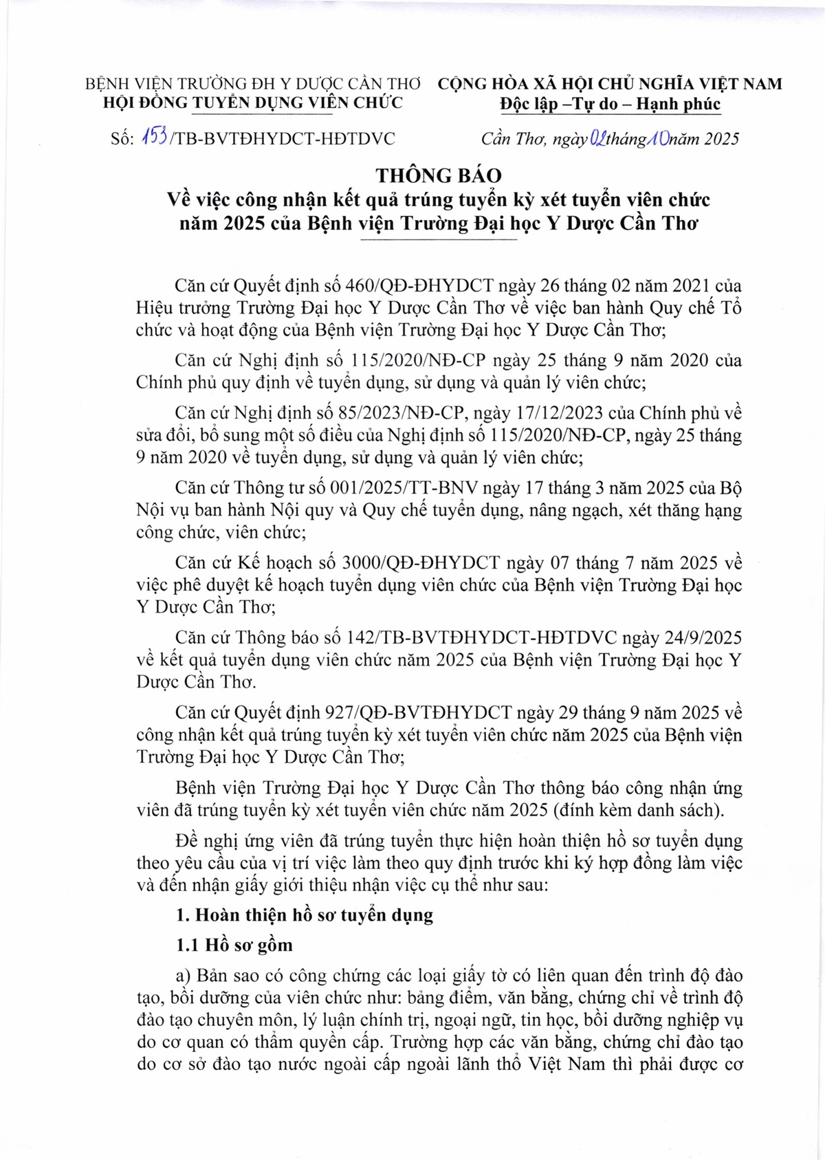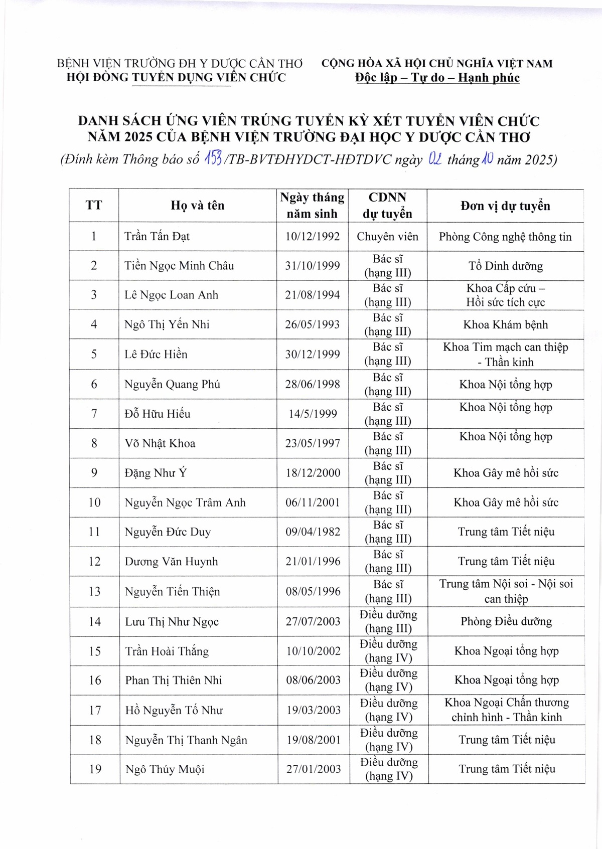 Thông báo số 153 công nhận kết quả trúng tuyển kỳ xét tuyển viên chức năm 2025 của Bệnh viện Trường Đại học Y Dược Cần Thơ.