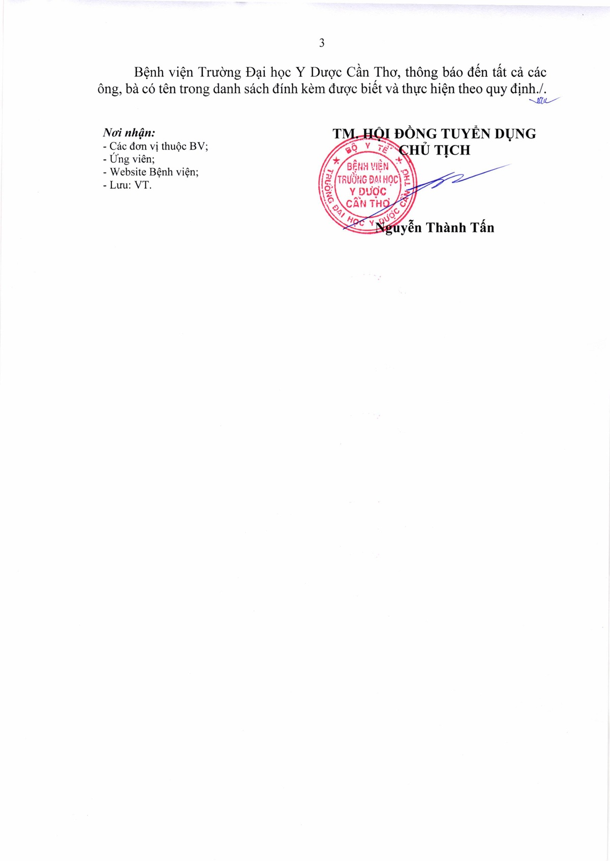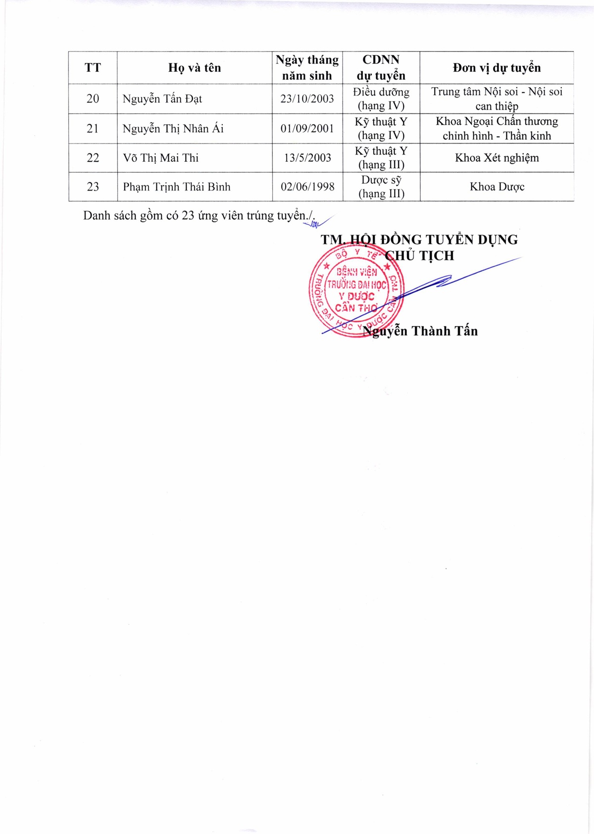Thông báo số 06 công nhận kết quả trúng tuyển kỳ xét tuyển viên chức đợt 2 năm 2025 của Bệnh viện Trường Đại học Y Dược Cần Thơ