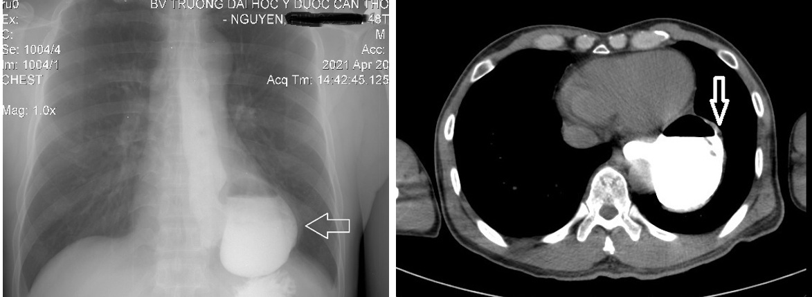 1. Trường hợp thứ nhất: Bệnh nhân nam, 48 tuổi vào Bệnh viện Trường Đại học Y Dược Cần Thơ vì khó nuốt, cách nhập viện khoảng 1 năm, bệnh nhân cảm thấy khó nuốt với thức ăn đặc, cảm giác khó chịu sau xương ức, thỉnh thoảng có ợ nóng và nôn ra thức ăn. Cách nhập viện # 3 tháng, bệnh nhân cảm giác nuốt nghẹn với thức ăn lỏng, nước, cảm giác khó tiêu, ợ hơi nhiều sau ăn, đôi khi có ho khan, sụt cân # 2-3 kg/năm. Không có yếu tố tăng nặng hoặc giảm nhẹ cụ thể, khám sức khỏe không phát hiện bất thường. Chỉ số BMI của bệnh nhân trong giới hạn bình thường. Khi khám, thấy bụng mềm nhưng có cảm giác đau vừa phải ở thượng vị. Điện tâm đồ, siêu âm tim và chụp X-quang phổi của bệnh nhân đều bình thường. Vì vậy, các nguyên nhân tim và phổi đã được loại trừ. Các xét nghiệm của bệnh nhân bao gồm xét nghiệm máu thường quy, sinh hóa và siêu âm ổ bụng chưa ghi nhận bất thường. X-quang thực quản-dạ dày có uống thuốc cản quang: túi thừa thực quản 1/3 dưới. MSCT ngực: Túi thừa thực quản 1/3 dưới, tổn thương mô kẽ và xơ đỉnh phổi (P) nghĩ tổn thương cũ