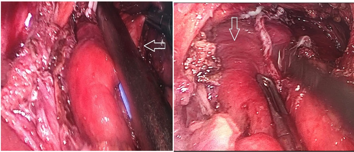 Bệnh nhân được chỉ định phẫu thuật nội soi cắt túi thừa thực quản kèm điều trị trào ngược dạ dày thực quản. Phương pháp vô cảm: Mê nội khí quản. Tiến hành cắt túi thừa, chống trào ngược bằng phương pháp Dor. Phẫu tích cắt dọc tới cổ túi chỗ nối thực quản dạ dày có động mạch đường kính khoảng 3mm chạy ngang đè vào ống niêm mạc ngang vùng cổ túi thừa, xử trí cắt động mạch. Thời gian cuộc mổ khoảng 4 giờ, lượng máu mất khoảng 20ml. Không ghi nhận tai biến trong lúc mổ.