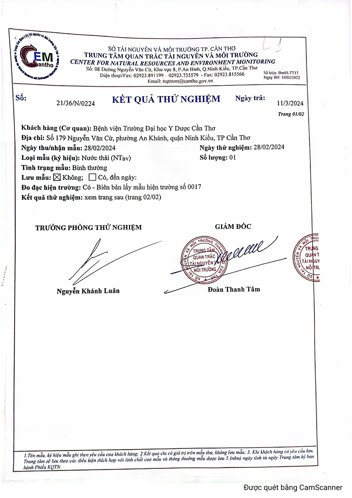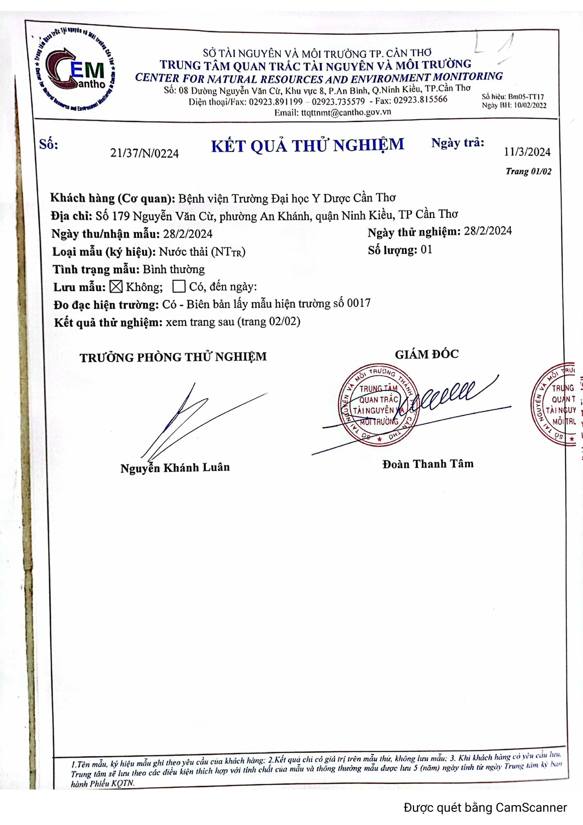 Kết quả quan trắc nước thải quý 1 năm 2024 của Bệnh viện Trường Đại học Y Dược Cần Thơ.