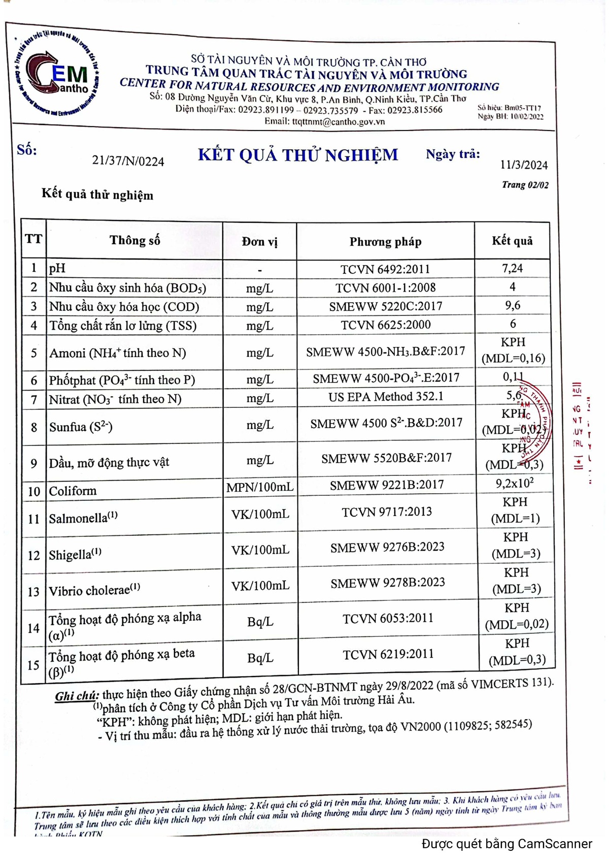 Kết quả quan trắc nước thải đột xuất năm 2024 của Bệnh viện Trường Đại học Y Dược Cần Thơ