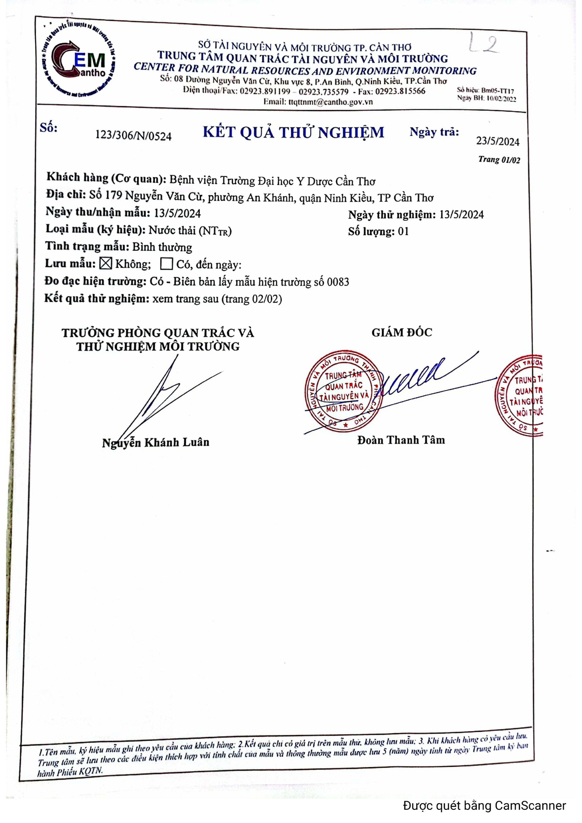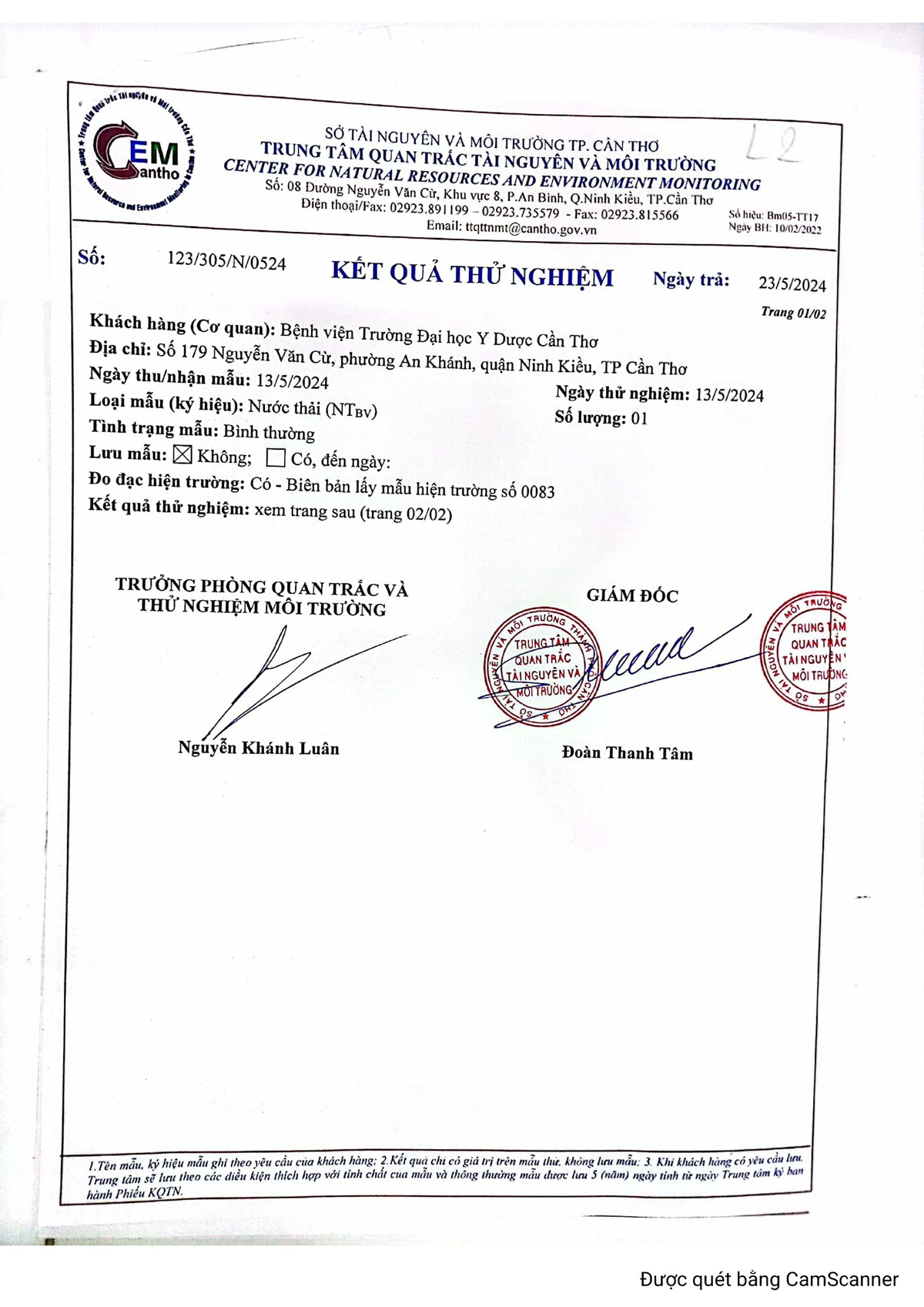 Kết quả quan trắc nước thải quý 1 năm 2024 của Bệnh viện Trường Đại học Y Dược Cần Thơ