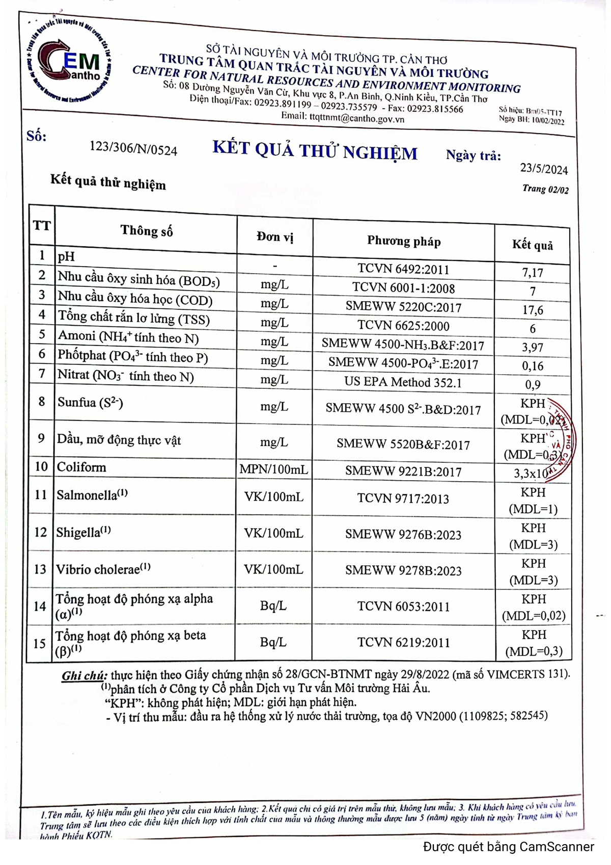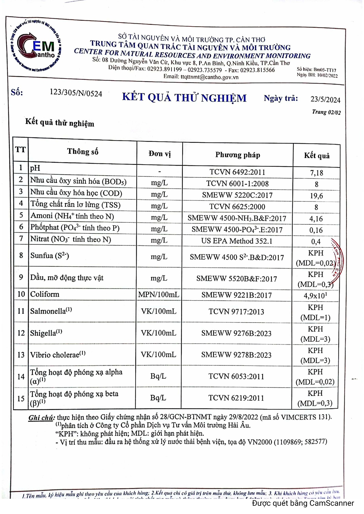 Kết quả quan trắc nước thải quý 2 năm 2024 của Bệnh viện Trường Đại học Y Dược Cần Thơ