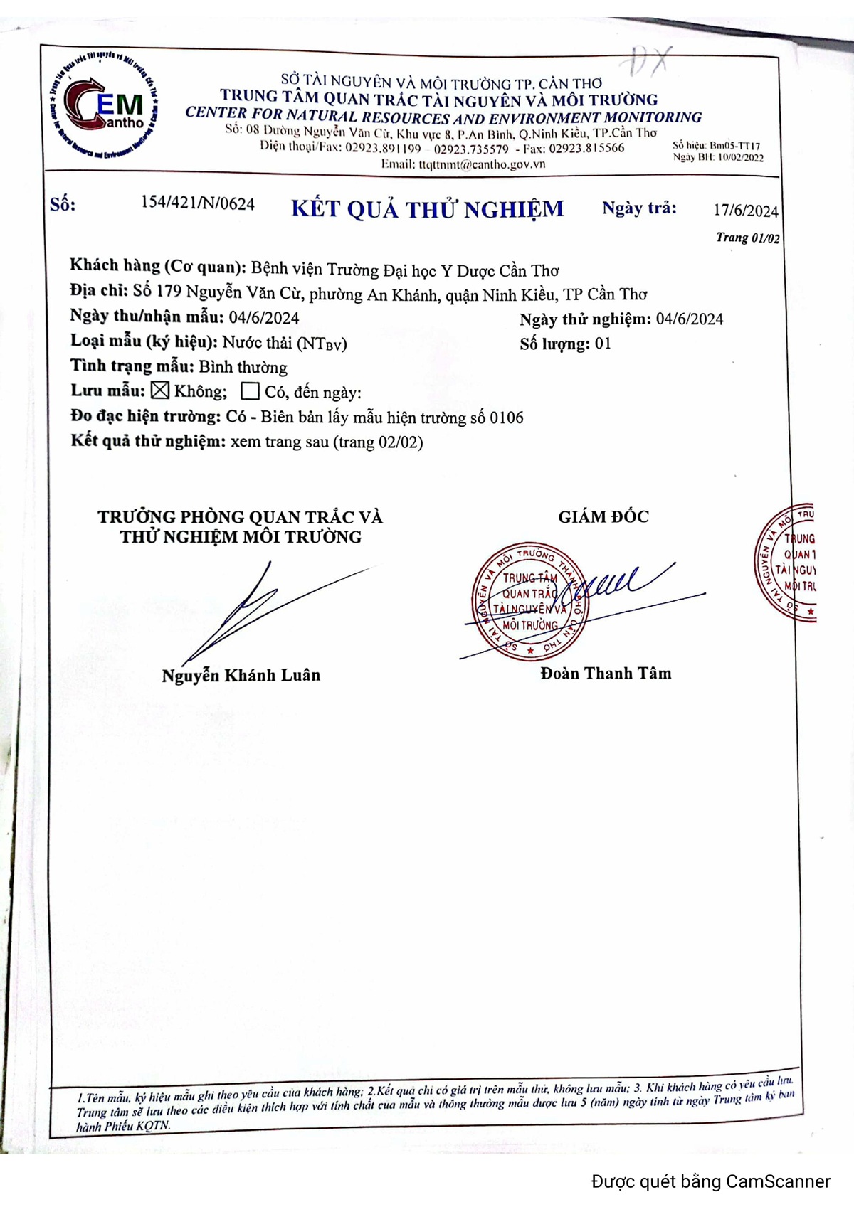 Kết quả quan trắc nước thải quý 1 năm 2024 của Bệnh viện Trường Đại học Y Dược Cần Thơ
