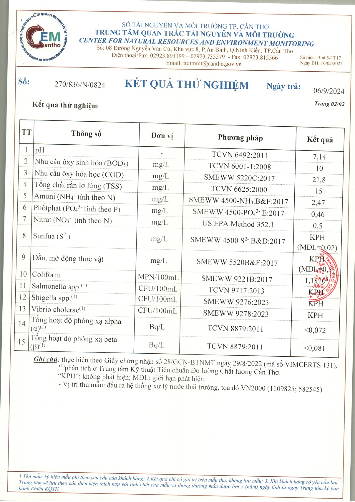 Kết quả quan trắc nước thải quý 3 năm 2024 của Bệnh viện Trường Đại học Y Dược Cần Thơ