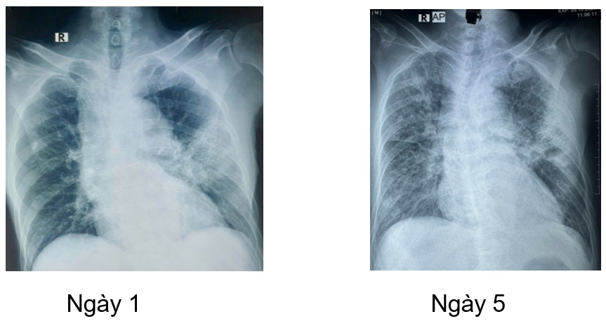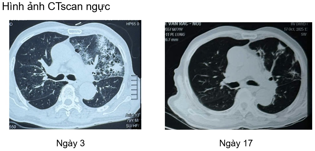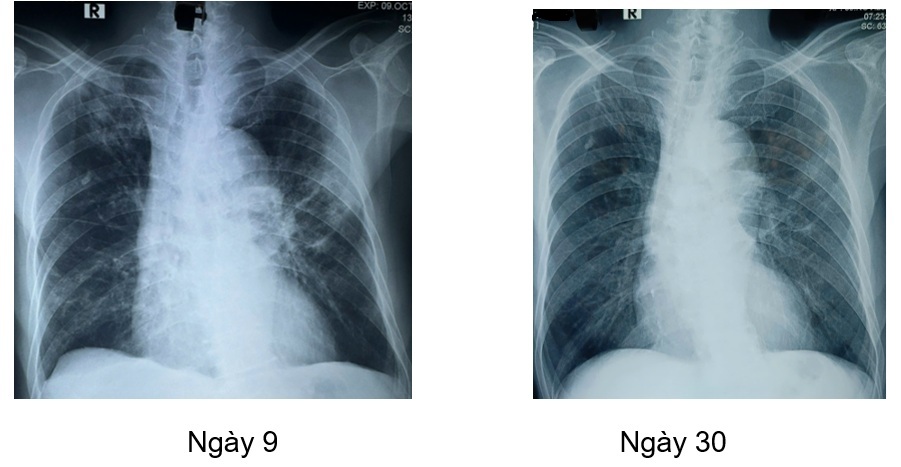 Bệnh nhân được tiếp tục duy trì phác đồ kháng nấm anidulafugin và fluconazole (hạ bậc kháng nấm), trong quá trình điều trị bệnh nhân được khám chuyên khoa mắt, theo dõi men gan, chức năng thận, bilan nhiễm trùng cũng như hình ảnh học (CTscan ngực, xquang ngực thẳng). Dưới đây một vài hình ảnh học trong quá trình điều trị nội, ngoại trú.