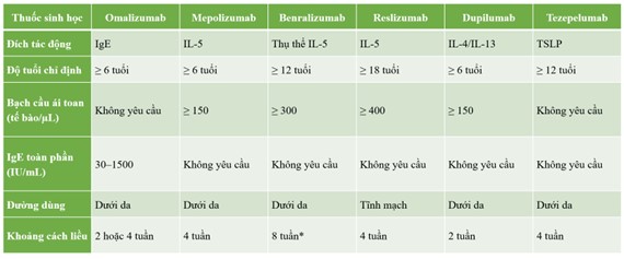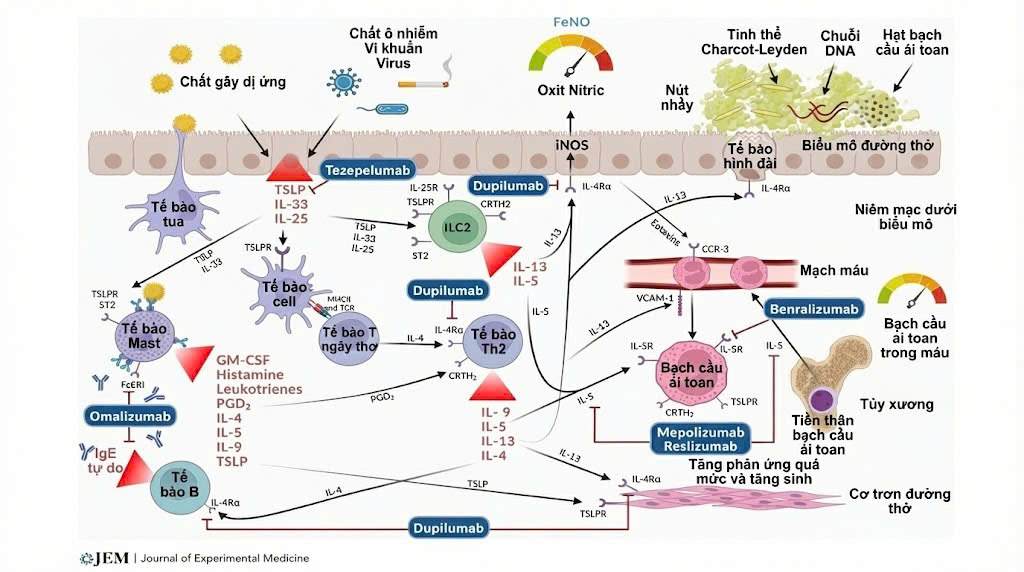 Liệu pháp sinh học trong hen nặng bao gồm các kháng thể đơn dòng nhắm trúng các phân tử then chốt trong con đường viêm typ 2, như IgE, IL-5, thụ thể IL-5, IL-4Rα và TSLP [2,5].