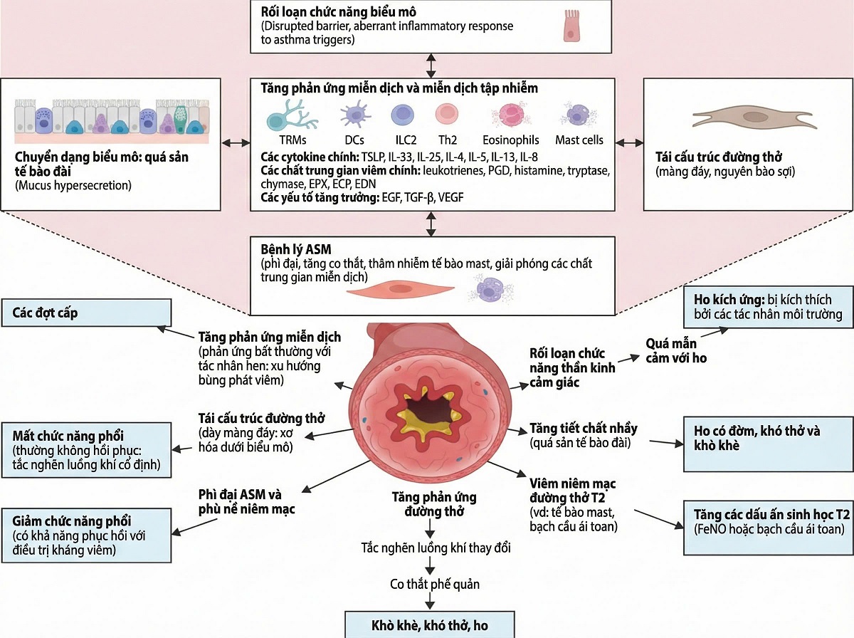 Trong những năm gần đây, nhận thức về vai trò của biểu mô đường thở trong sinh bệnh học hen đã thay đổi đáng kể. Biểu mô không chỉ là hàng rào cơ học mà còn là nguồn tiết các cytokine khi bị tổn thương bởi dị nguyên, virus hô hấp, ô nhiễm không khí hoặc khói thuốc lá [4].