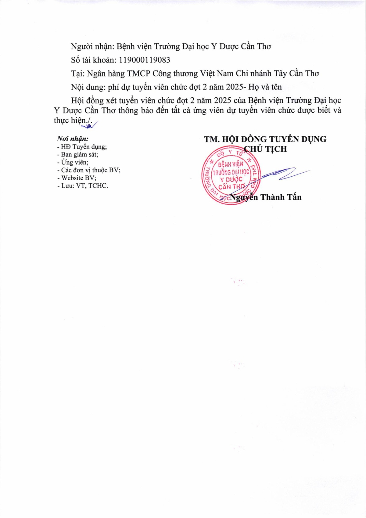 Thông báo số 06 công nhận kết quả trúng tuyển kỳ xét tuyển viên chức đợt 2 năm 2025 của Bệnh viện Trường Đại học Y Dược Cần Thơ