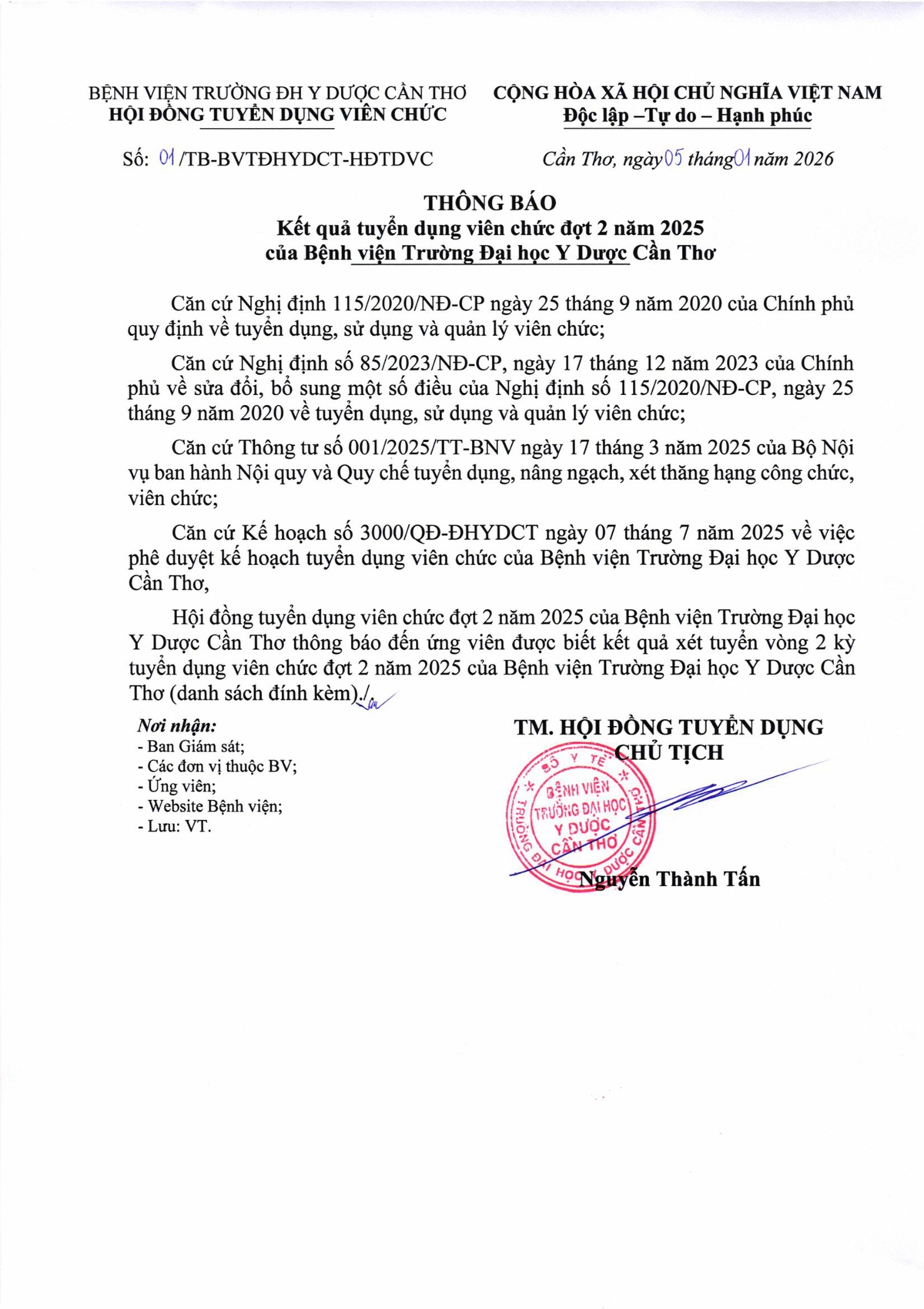 Thông báo số 01 Kết quả tuyển dụng viên chức đợt 2 năm 2025 của Bệnh viện Trường Đại học Y Dược Cần Thơ