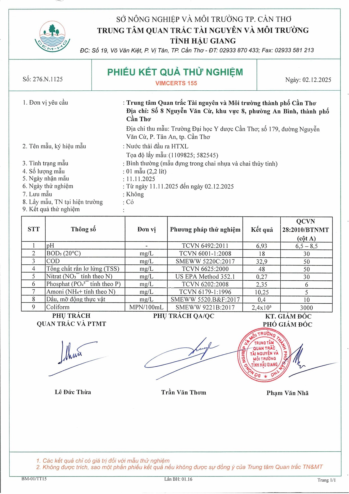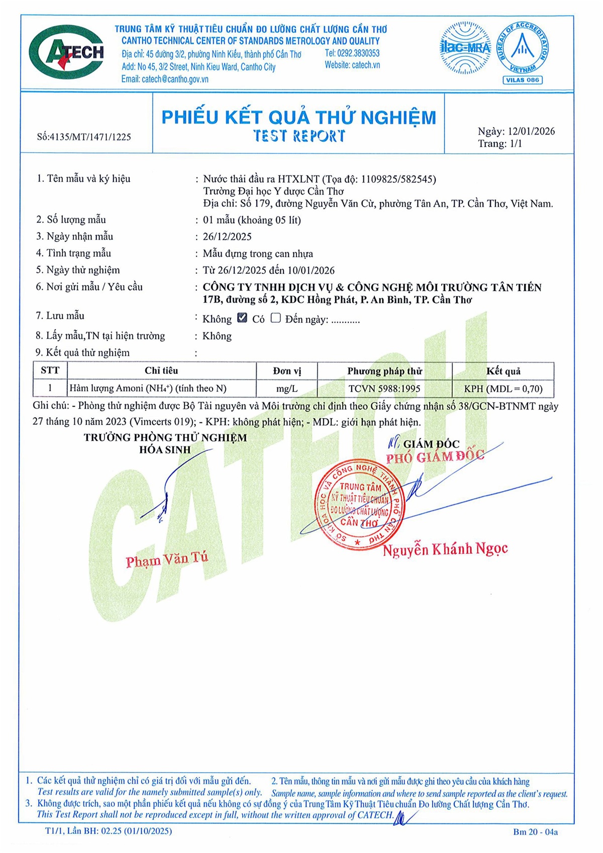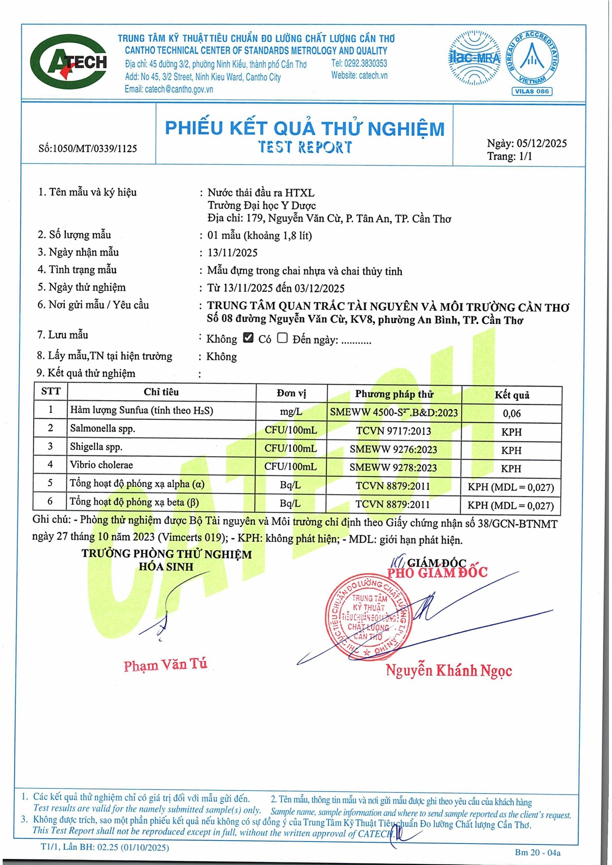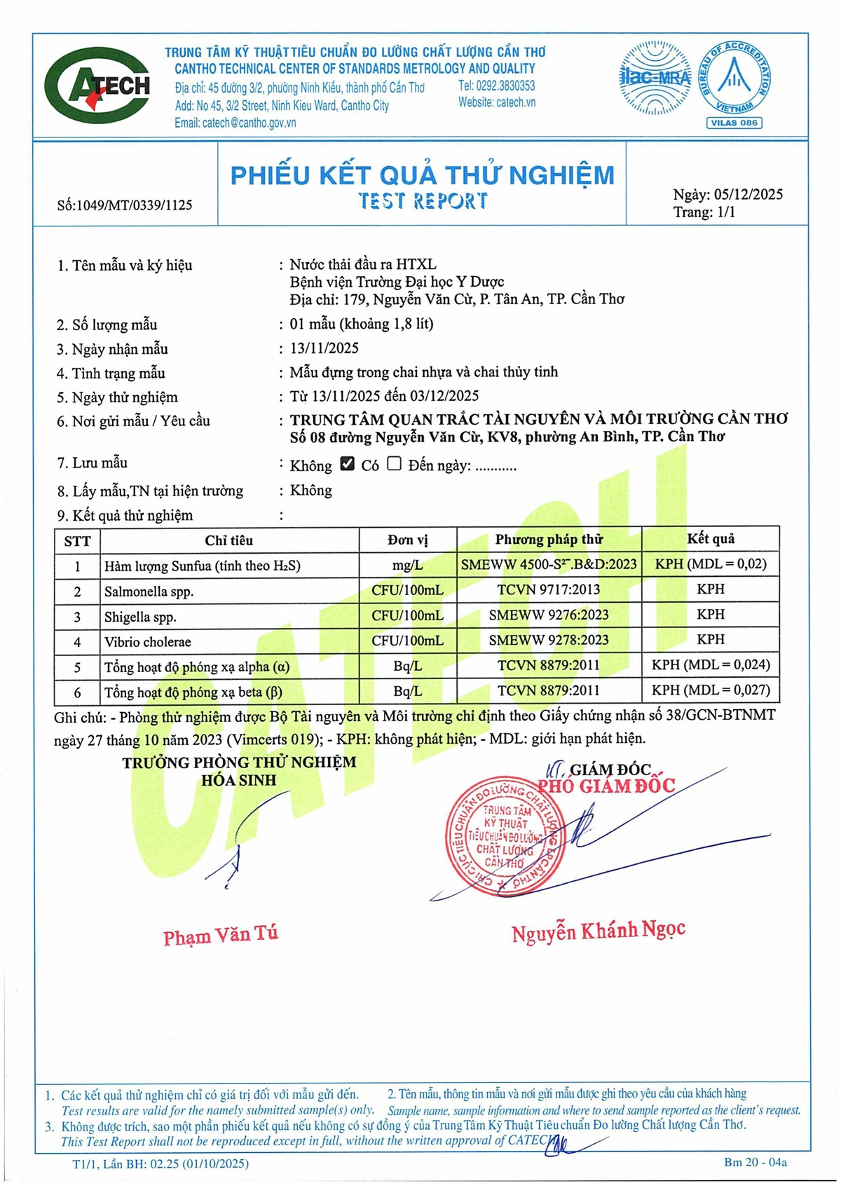 Kết quả quan trắc nước thải quý 4 năm 2025 của Bệnh viện Trường Đại học Y Dược Cần Thơ