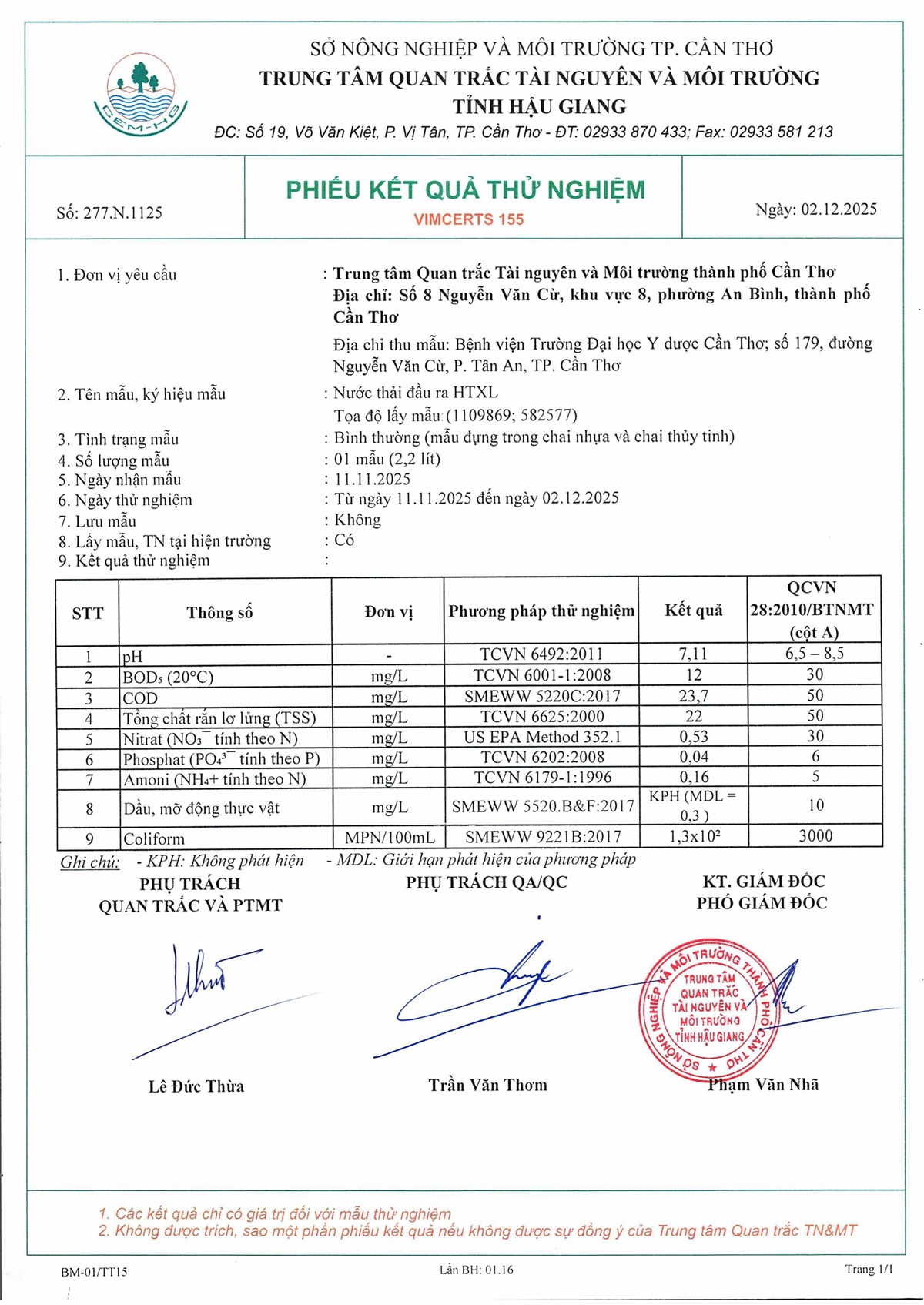 Kết quả quan trắc nước thải quý 4 năm 2025 của Bệnh viện Trường Đại học Y Dược Cần Thơ.