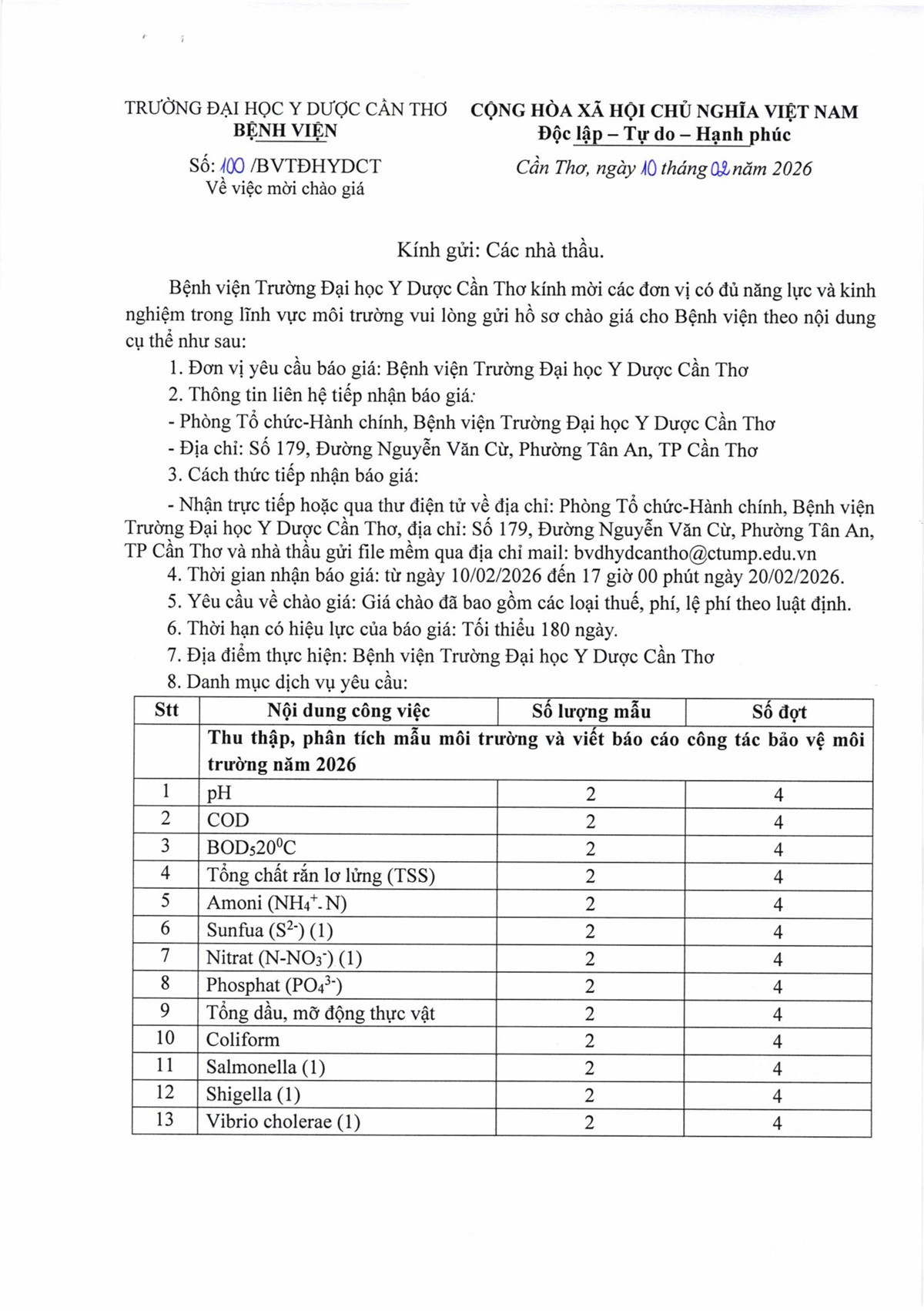 Về việc yêu cầu báo giá thuốc sử dụng tại Bệnh viện Trường Đại học Y Dược Cần Thơ
