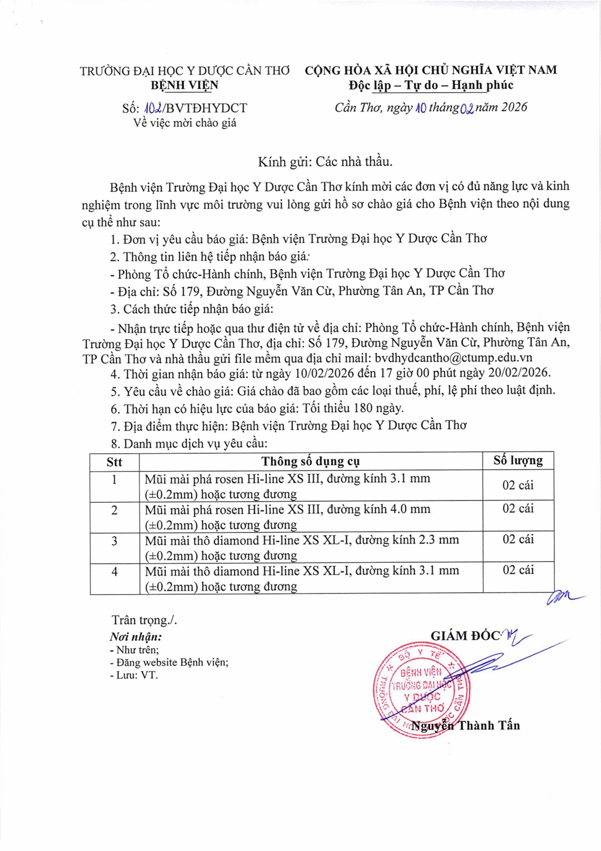 Về việc yêu cầu báo giá thuốc sử dụng tại Bệnh viện Trường Đại học Y Dược Cần Thơ