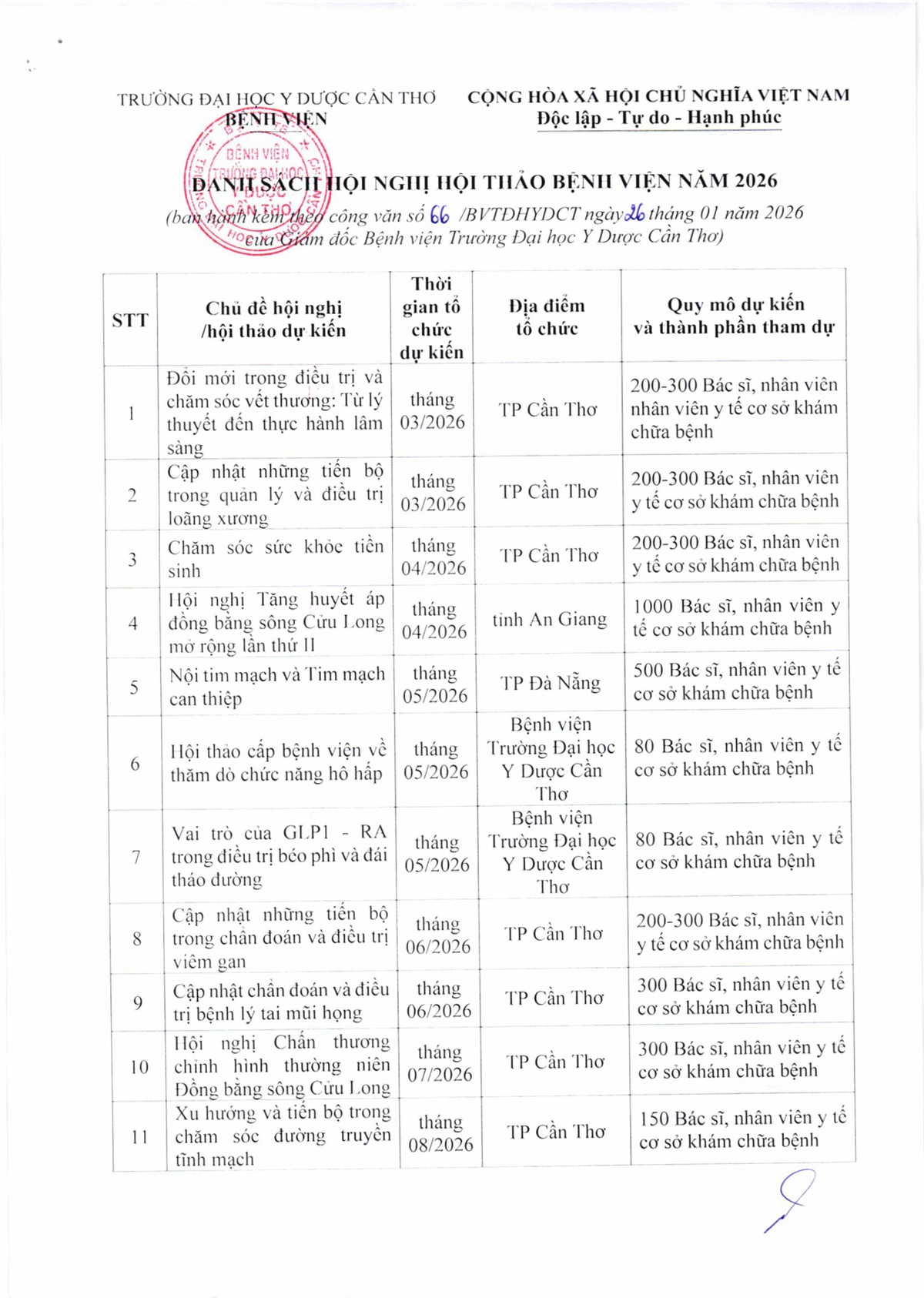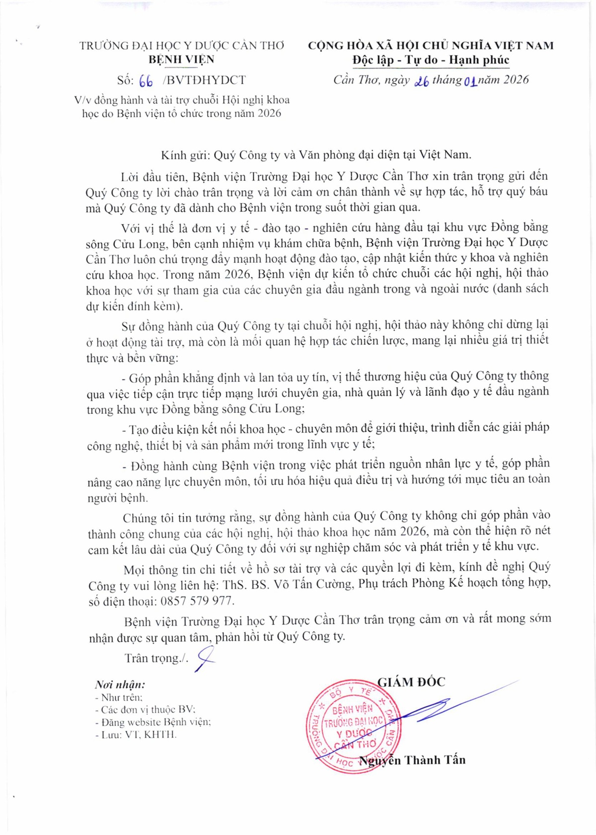 BỆNH VIỆN TRƯỜNG ĐẠI HỌC Y DƯỢC CẦN THƠ MỜI DOANH NGHIỆP ĐỒNG HÀNH CHUỖI HỘI NGHỊ – HỘI THẢO KHOA HỌC NĂM 2026.
