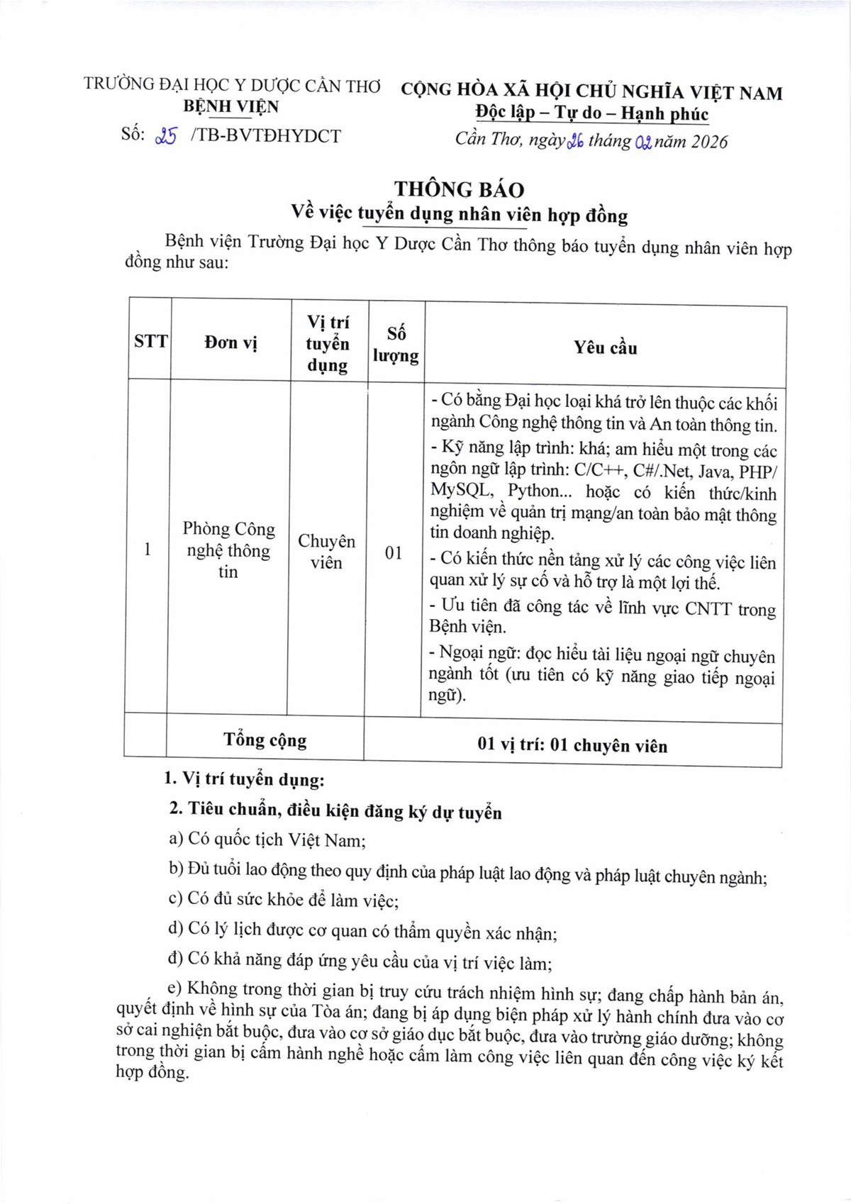 Thông báo về việc tuyển dụng nhân viên hợp đồng