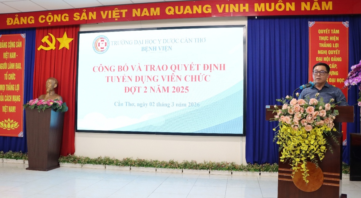 Bệnh viện Trường Đại học Y Dược Cần Thơ đã tổ chức Lễ công bố và trao quyết định cho các viên chức trúng tuyển kỳ xét tuyển đợt 2 năm 2025 vào chiều ngày 02/3/2026 tại Hội trường Giao ban Bệnh viện. Sự kiện đánh dấu việc bổ sung nguồn nhân lực chất lượng cao, góp phần nâng cao năng lực phục vụ sức khỏe cộng đồng của Bệnh viện.