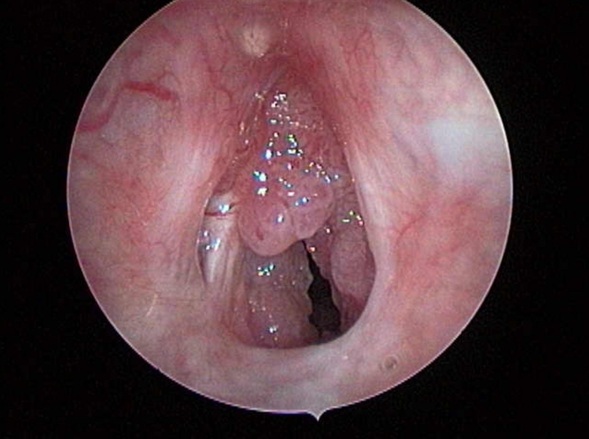 Nội soi họng: Khối papilloma màu hồng, dạng sùi nhiều thùy, bề mặt không chảy máu, chiếm gần trọn thanh môn.