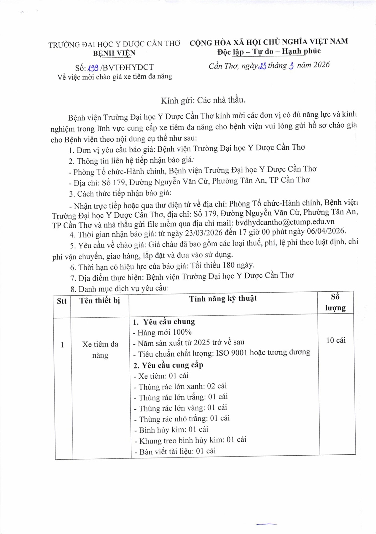Về việc yêu cầu báo giá thuốc sử dụng tại Bệnh viện Trường Đại học Y Dược Cần Thơ