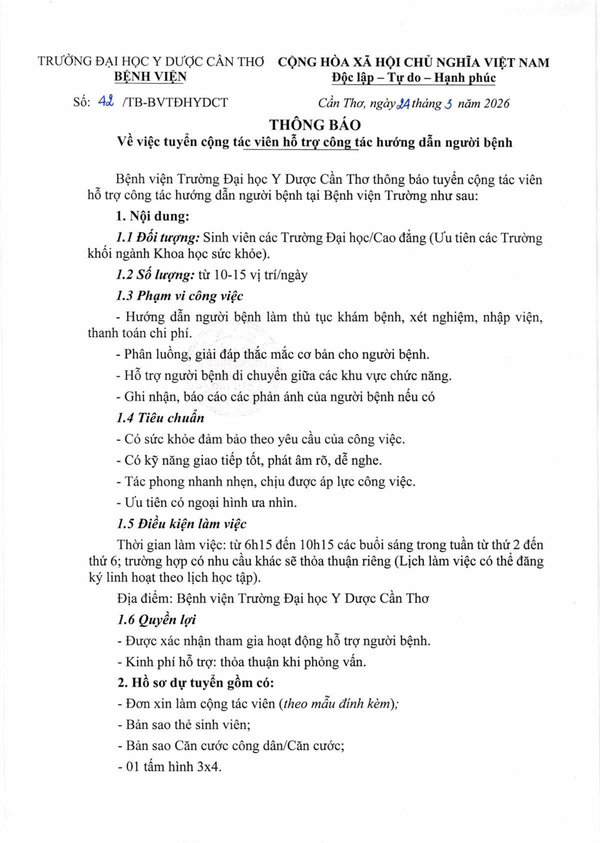 Thông báo số 42 về việc tuyển cộng tác viên hỗ trợ công tác hướng dẫn người bệnh