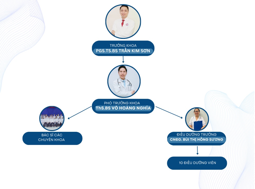 Hiện nay cơ cấu tổ chức gồm: 13 cán bộ trong đó có 11 cán bộ cơ hữu, 02 cán bộ kiêm nhiệm. 01 Trưởng khoa, 01 phó khoa, 01 Điều dưỡng trưởng, có 39 phòng khám chuyên khoa, nhân sự của các phòng khám là Giáo sư, Phó giáo sư, Tiến sĩ, Thạc sĩ, Chuyên khoa II, chuyên khoa I, giảng viên… từ các bộ môn thuộc Trường Đại học Y Dược Cần Thơ.( là các chuyên gia đầu ngành, Bác sỹ có kinh nghiệm thuộc nhiều lĩnh trong chẩn đoán và điều trị của Trường ĐHYDCT)…